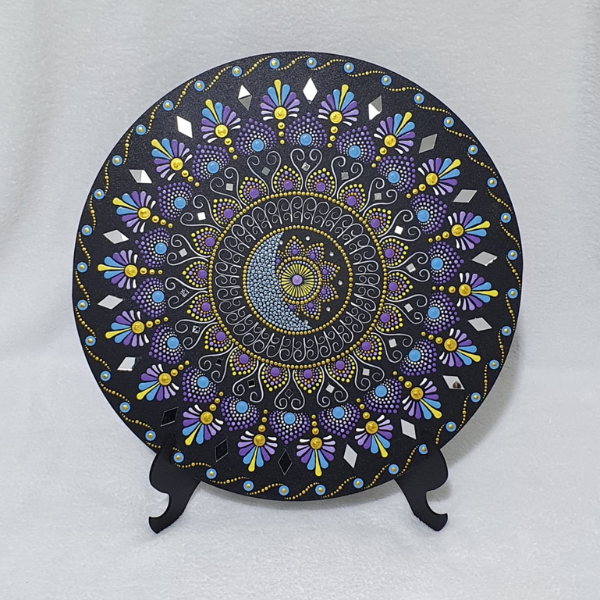 Mandala com base em MDF, apliques em espelho. Acompanha suporte de mesa.