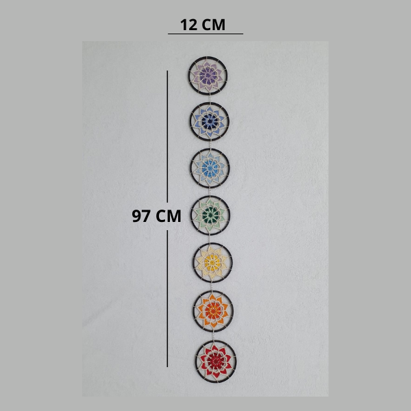 Mobile 7 Chakras, feito com fio de algodão e aros em MDF, separados por contas de acrílico